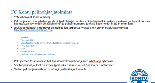 FC Kontun harjoituspeleihin ja turnauksiin pelinohjaajia voi tiedustella osoitteesta fckontu.pelinohjaajat@gmail.com